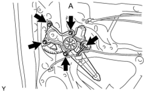 (d) Install the rear door window regulator sub-assembly with the 3 bolts, and tighten bolt A.