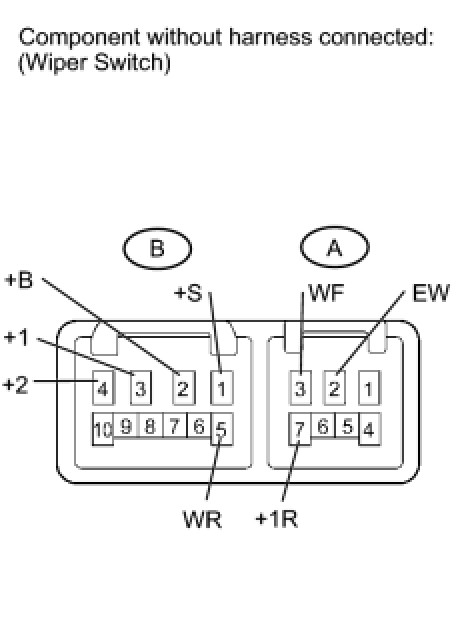 (5) Connect the negative (-) battery lead to terminal 1 (+S) of the B connector. Operate the intermittent wiper relay and check the voltage between terminals 3 (+1) of the B connector and 2 (EW) of the A connector.