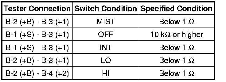 If the result is not as specified, replace the windshield wiper switch.