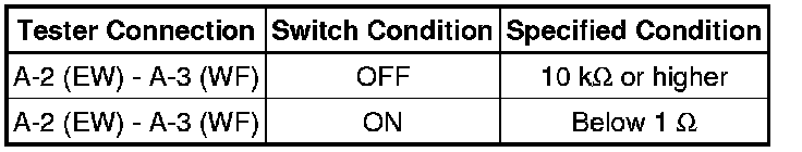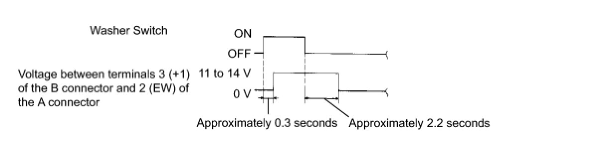 (3) Connect the positive (+) voltmeter terminal to terminal 3 (+1) of the B connector and the negative (-) voltmeter terminal to terminal 2 (EW) of the A connector. Turn the washer switch on and off, and check the voltage between terminals 3 (+1) of the B connector and 2 (EW) of the A connector.
