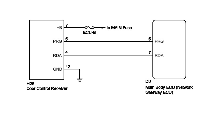 The door control receiver receives signals from the transmitter and sends these signals to the main body ECU (network gateway ECU). The main body ECU (network gateway ECU) then controls all doors by sending lock/unlock signals to each door.