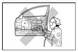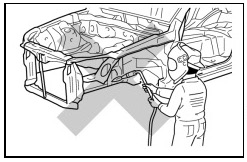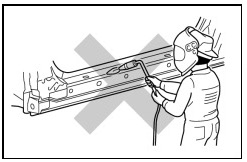 a. Rustproof high strength steel sheets are used for the body frame. Therefore, if these parts are heat repaired using an acetylene torch or equivalent, the crystalline structure changes, causing the strength of the steel sheets to decrease. Also, the zinc coating which is used to protect the body from rust will be damaged. This causes the surface of the steel sheets to become oxidized, which reduces their ability to resist rust.