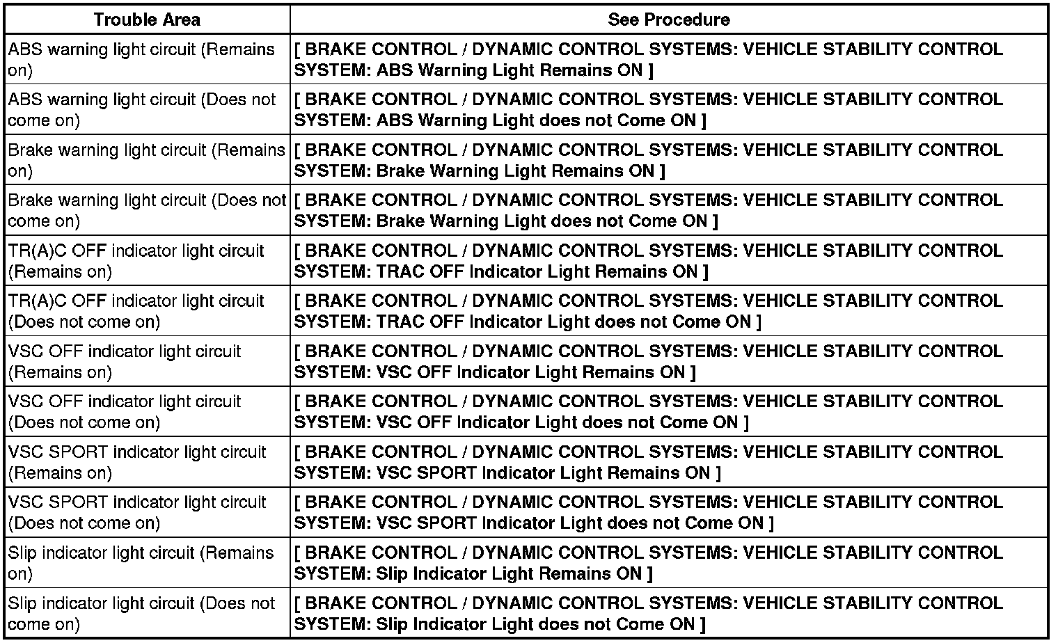 (1) When the ignition switch is turned to ON, check that the brake warning, TR(A)C OFF indicator, VSC OFF indicator and VSC SPORT indicator lights turn off after 3 seconds.