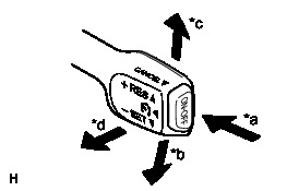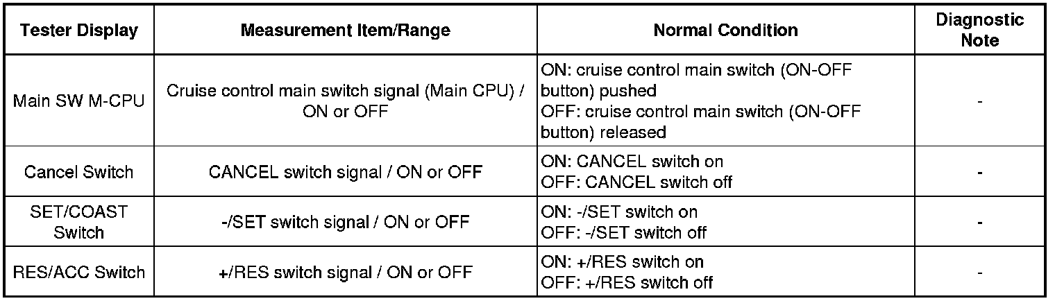 The cruise control main switch is used to turn the cruise control system on and off, as well as operate 7 functions: SET, - (COAST), TAP-DOWN, RES (RESUME), + (ACCEL), TAP-UP and CANCEL. The SET, TAP-DOWN and - (COAST) functions, and the RES (RESUME), TAP-UP and + (ACCEL) functions are operated with the same switch. The cruise control main switch is an automatic return type switch which turns on only while operating it in the direction of each arrow and turns off after releasing it. The internal contact points of the cruise control main switch turn on with switch operation. Then the ECM reads the voltage value that has been changed by the switch operation to control SET, - (COAST), RES (RESUME), + (ACCEL), and CANCEL.