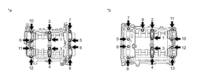 (e) Tighten the bolts in the order shown in the illustration to install the front camshaft cap, intake center camshaft cap, intake rear camshaft cap, exhaust center camshaft cap and exhaust rear camshaft cap.