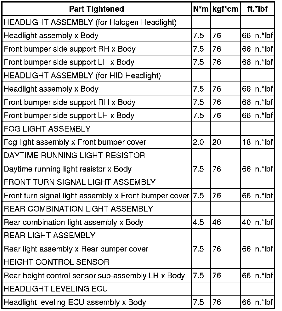 SPECIFICATIONS: LIGHTING (EXT): TORQUE SPECIFICATIONS; 2013 MY FR-S [03/2012 -]