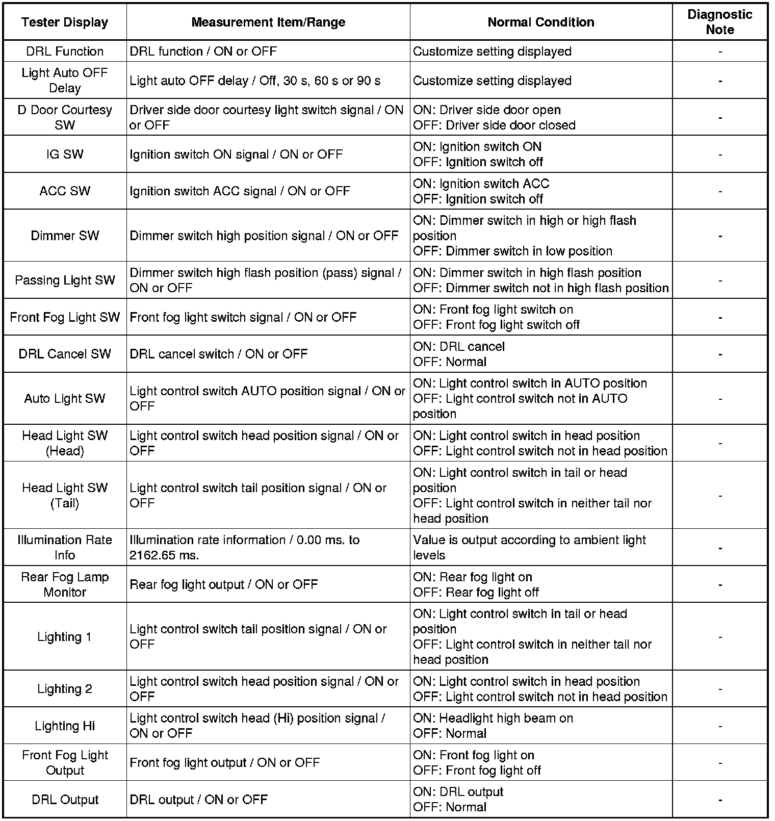 LIGHTING (EXT): LIGHTING SYSTEM: DATA LIST / ACTIVE TEST; 2013 MY FR-S [03/2012 -]