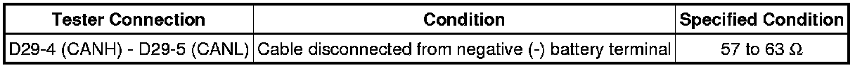 * Before measuring the resistance of the CAN bus, turn the ignition switch off and leave the vehicle for 1 minute or more without operating the key, switches or opening or closing the doors. After that, disconnect the cable from the negative (-) battery terminal and leave the vehicle for 1 minute or more before measuring the resistance.