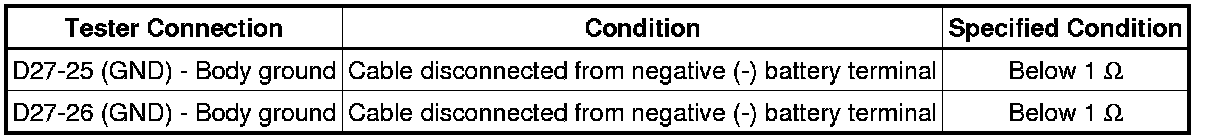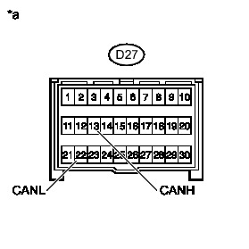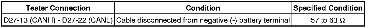 * Before measuring the resistance of the CAN bus, turn the ignition switch off and leave the vehicle for 1 minute or more without operating the key, switches or opening or closing the doors. After that, disconnect the cable from the negative (-) battery terminal and leave the vehicle for 1 minute or more before measuring the resistance.