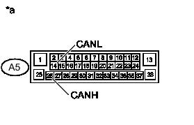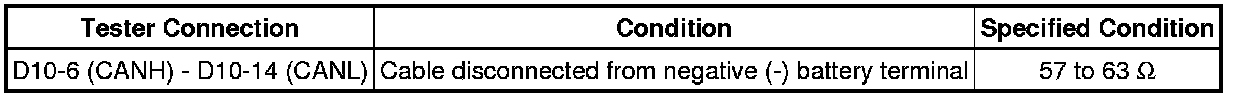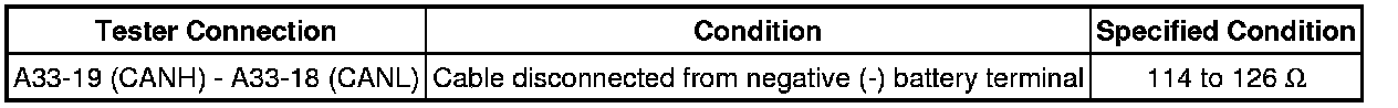 * Before measuring the resistance of the CAN bus, turn the ignition switch off and leave the vehicle for 1 minute or more without operating the key, switches or opening or closing the doors. After that, disconnect the cable from the negative (-) battery terminal and leave the vehicle for 1 minute or more before measuring the resistance.