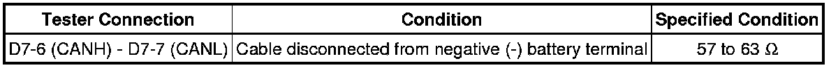 * Before measuring the resistance of the CAN bus, turn the ignition switch off and leave the vehicle for 1 minute or more without operating the key, switches or opening or closing the doors. After that, disconnect the cable from the negative (-) battery terminal and leave the vehicle for 1 minute or more before measuring the resistance.