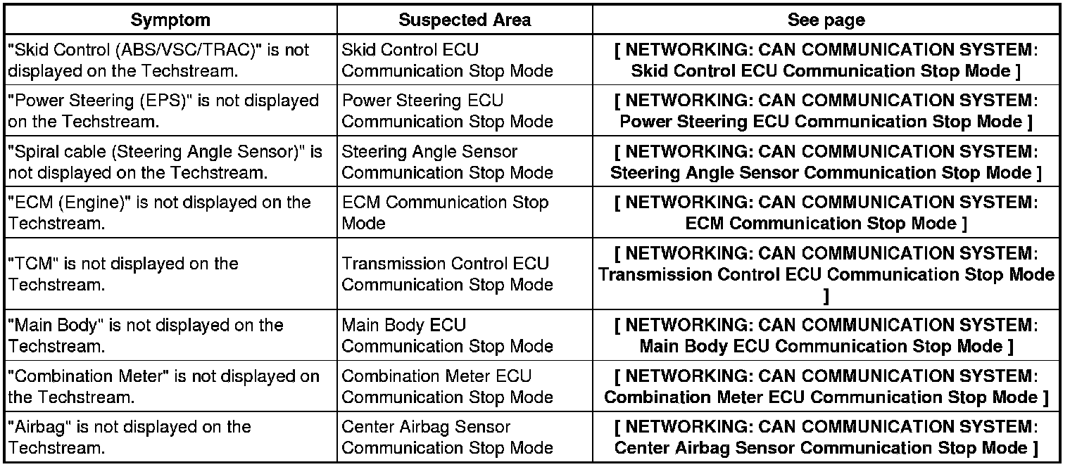 The suspected communication stop area can be determined based on the ECU or sensor that was not displayed in CAN Bus Check and by referring to the table below.