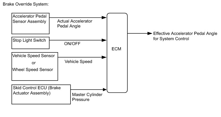 During brake override system control, the value for the accelerator pedal angle (which is used for engine control) is forcibly reduced to a specified value. For this reason, the Data List value for Accelerator Position will be replaced with a specified value regardless of the actual accelerator pedal angle (Accel Sens. No. 1 Volt %, Accel Sens. No. 2 Volt %)