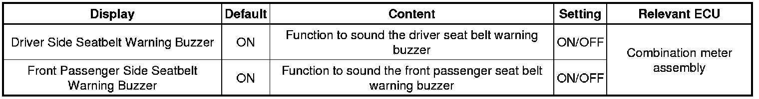 SEAT BELT: SEAT BELT WARNING SYSTEM: CUSTOMIZE PARAMETERS; 2013 MY FR-S [03/2012 -]