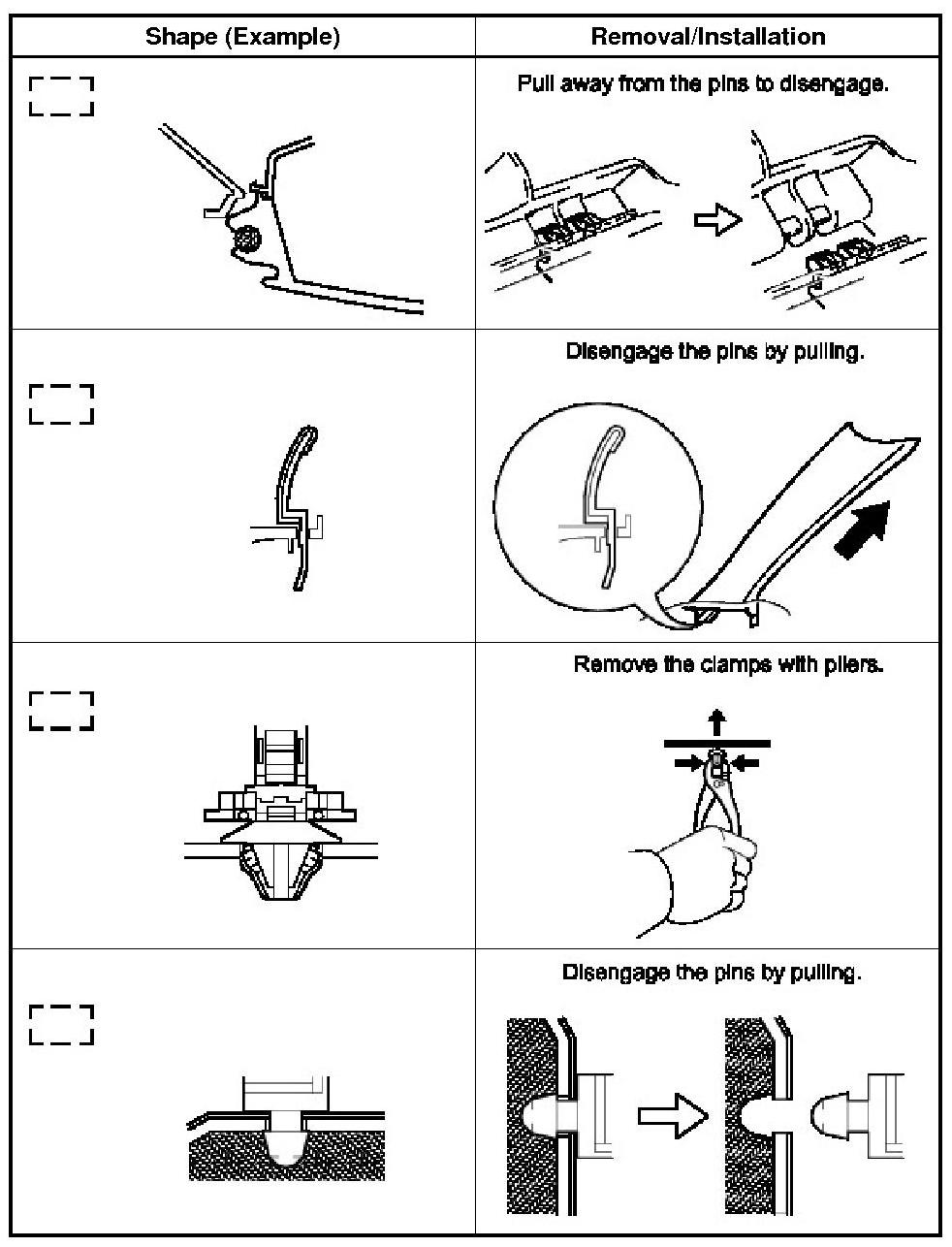 (1) The removal and installation methods of typical claws used for vehicle body parts are shown in the table below.