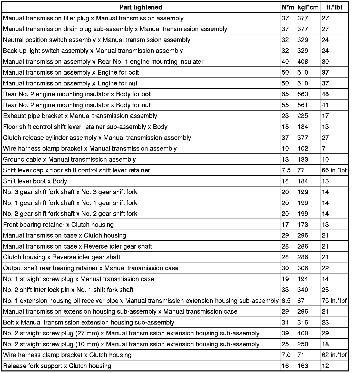 SPECIFICATIONS: TL70 MANUAL TRANSMISSION / TRANSAXLE: TORQUE SPECIFICATIONS; 2013 MY FR-S [03/2012 -]