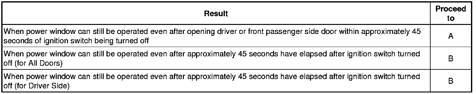 * When the driver or front passenger side door has not been opened, driver or front passenger side door power window regulator motor can control its power window operation for approximately 45 seconds after the ignition switch is turned from ON to off (the key is removed) by receiving operation permission signals from the main body ECU (network gateway ECU). However, when approximately 45 seconds have elapsed, or the driver or front passenger side door is opened within approximately 45 seconds after turning the ignition switch off (the key is removed), the power window regulator motor stops operating.