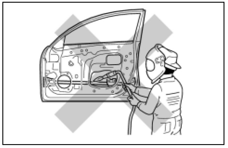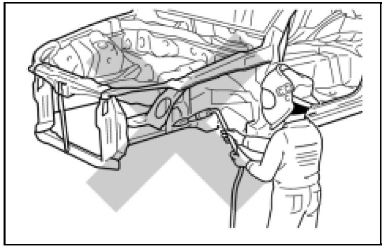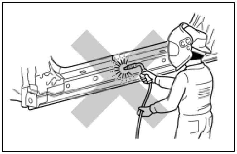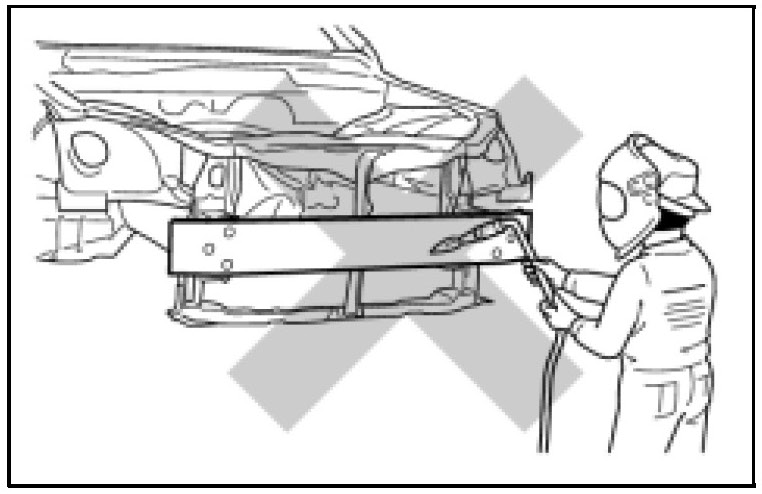 a. Rustproof high strength steel sheets are used for the body frame. Therefore, if these parts are heat repaired using an acetylene torch or equivalent, the crystalline structure changes, causing the strength of the steel sheets to decrease. Also, the zinc coating which is used to protect the body from rust will be damaged. This causes the surface of the steel sheets to become oxidized, which reduces their ability to resist rust.