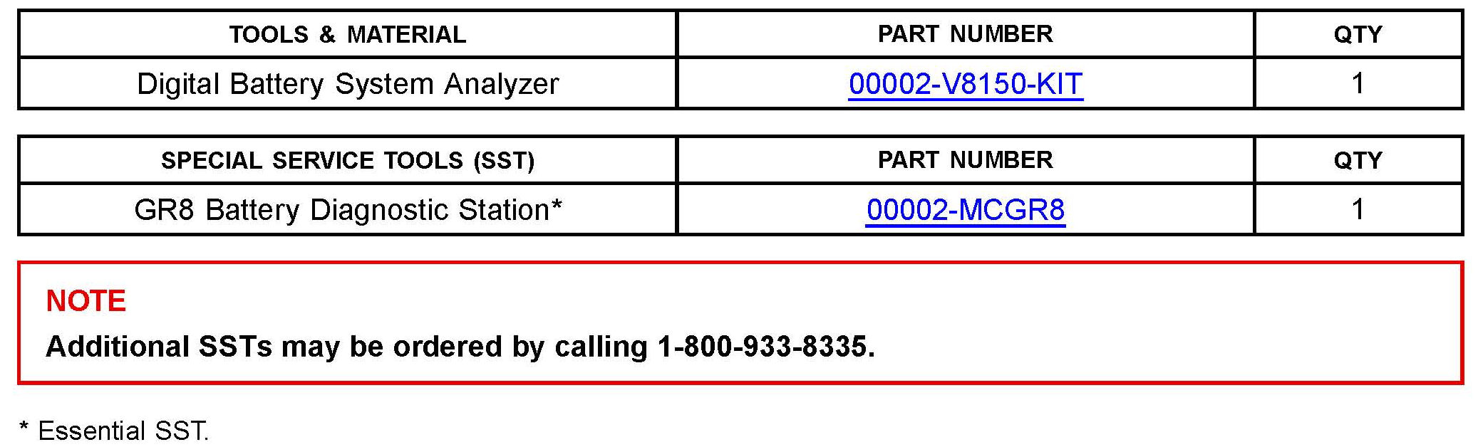 ^ Test batteries monthly (more often in high heat or cold areas), using the Digital Battery System Analyzer (P/N 00002-V8150-KIT). Refer to Service Bulletin No. PG001-06, "Battery Maintenance for In-Stock Vehicles and Pre-Delivery" for complete battery maintenance procedures.