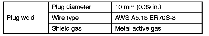 NOTICE: Be sure to use Metal active gas (Ar 80% + CO2 20%) as the shield gas when plug welding. Sufficient weld strength cannot be assured when using 100% CO2 shield gas.