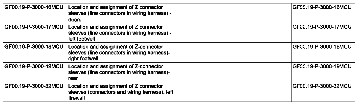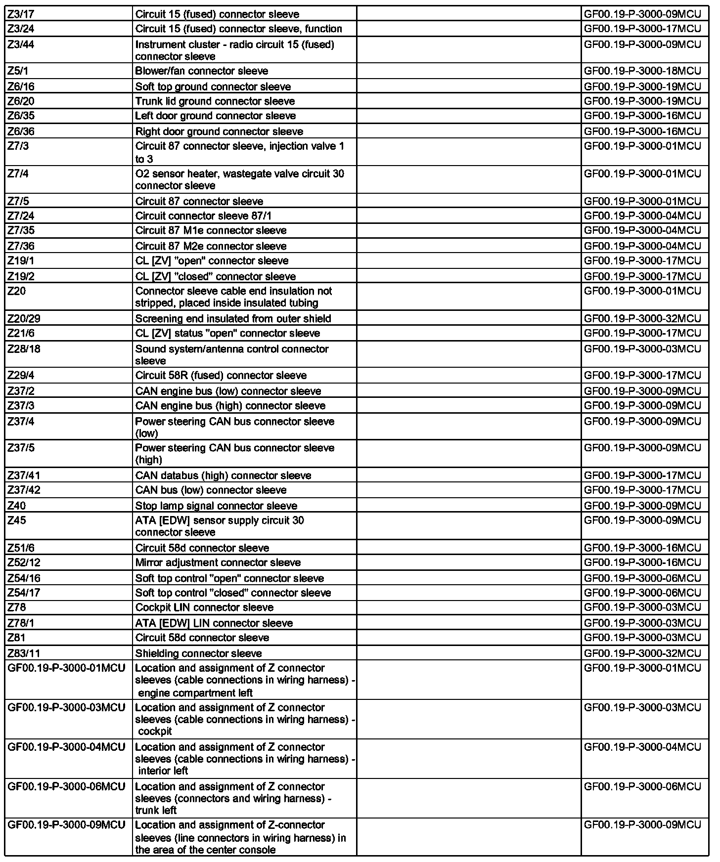 GF00.19-P-3000MCU Location and Assignment of Z Connector Sleeves (Wiring and Plug Connectors In Wiring Harness)