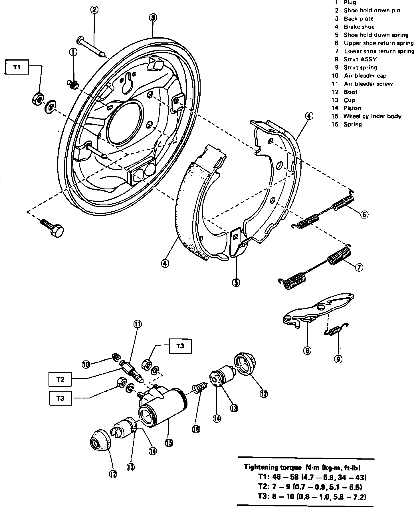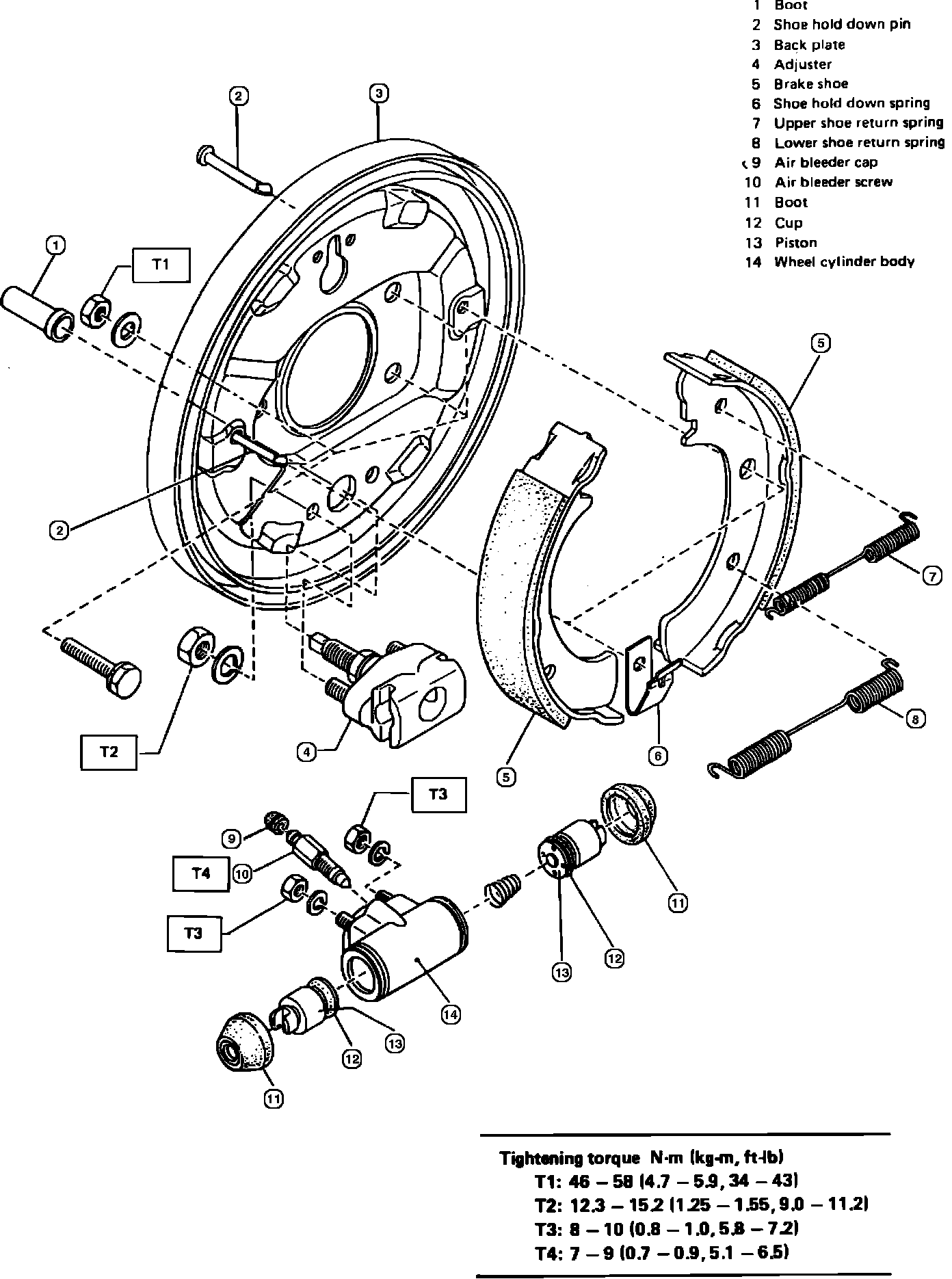 Fig. 1 Exploded view of drum brake assembly. Exc. 4 wheel drive models & Justy: