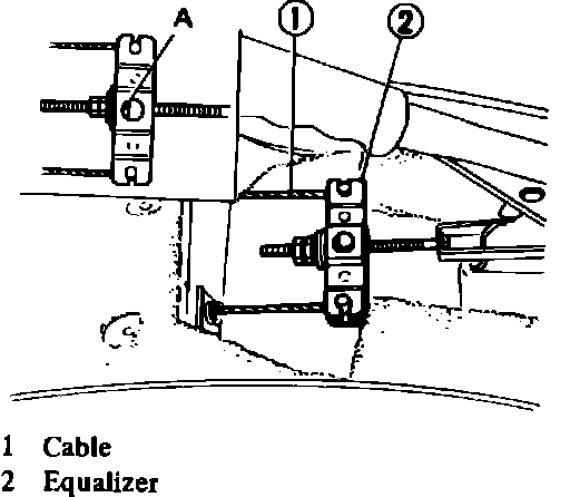 2. Rotate the equalizer cable adjustment nut until play at ``A'' in Fig. 9 is set at 0-.02 inch (0-.5 mm). Lock adjustment nut. The brake lever mechanism should click six to seven times when a force of 55 lbs. is exerted on the lever.