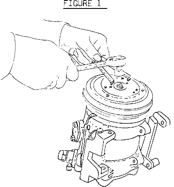 2. Hold the clutch hub from turning with the clutch spanner wrench (SOA 624 878). Remove the 13 mm hex head nut from the compressor shaft with a 13 mm socket wrench. (See Figure 1).