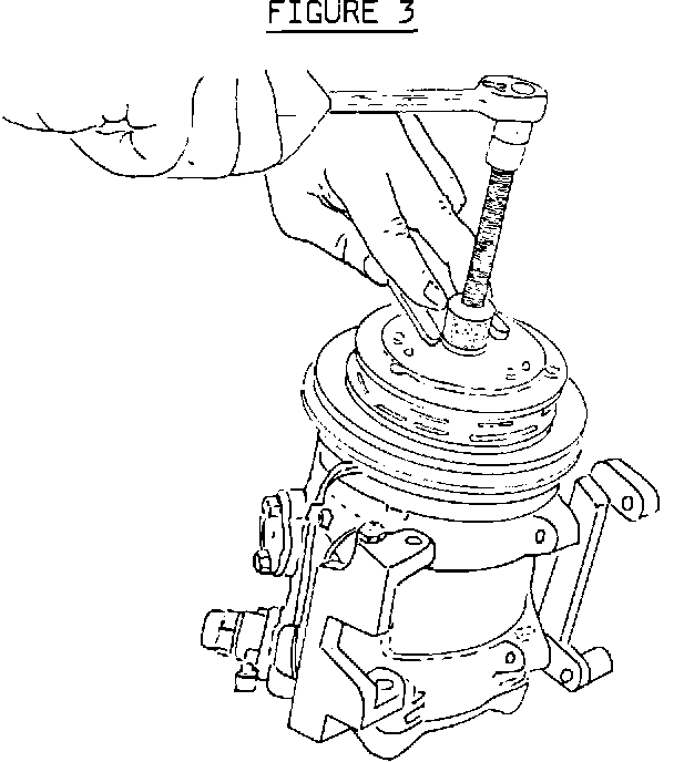 4. Place the clutch hub puller over the small capscrew and thread it into the clutch hub. Pull the clutch hub off of the compressor shaft by turning the clutch hub puller center bolt clockwise with a 15 mm socket wrench while holding the clutch hub with the clutch hub spanner wrench. (See Figure 3).