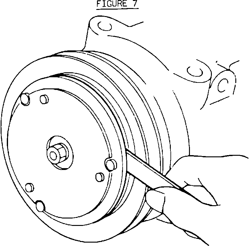 8. Remove the snap ring which retains the clutch coil with a pair of external snap ring pliers. Remove the Phillips screw which attaches the clutch wire to the compressor. Remove the compressor clutch coil. (See Figure 6).