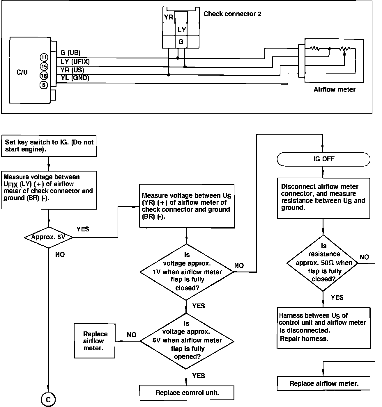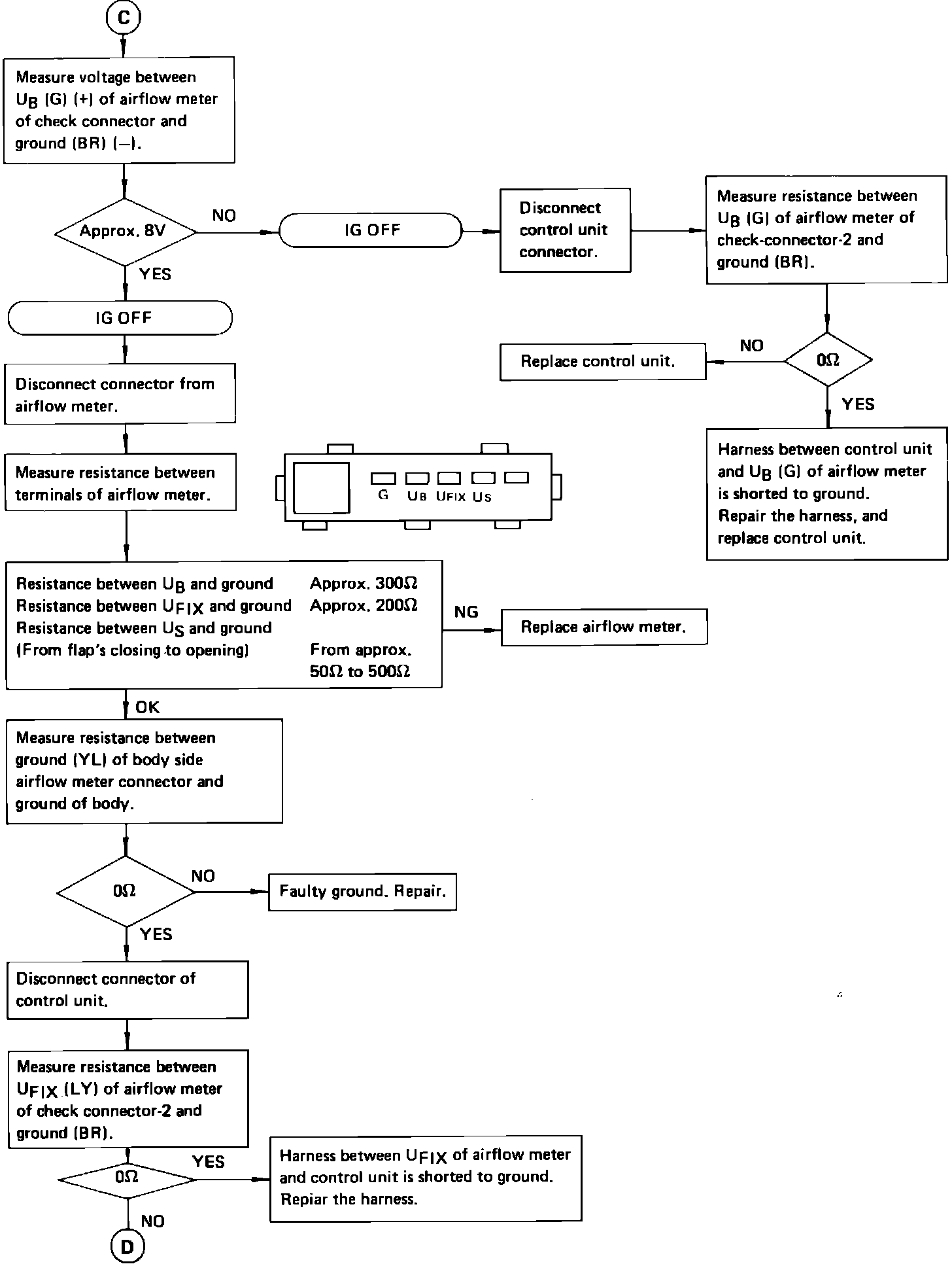 Fig. 9c EGI system troubleshooting chart. Checking air flow meter circuit (trouble code 14).:
