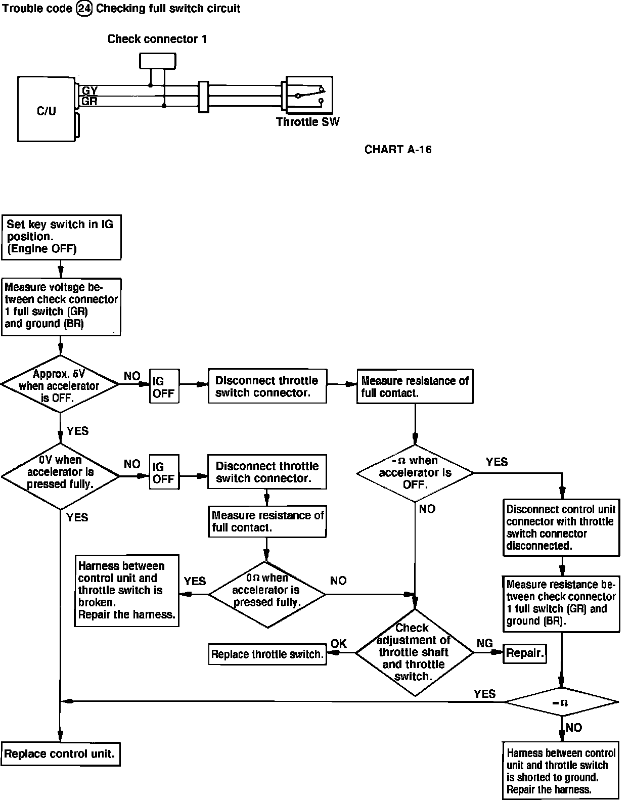 Fig. 14 EGI system troubleshooting chart. Checking full switch circuit (trouble code 24).: