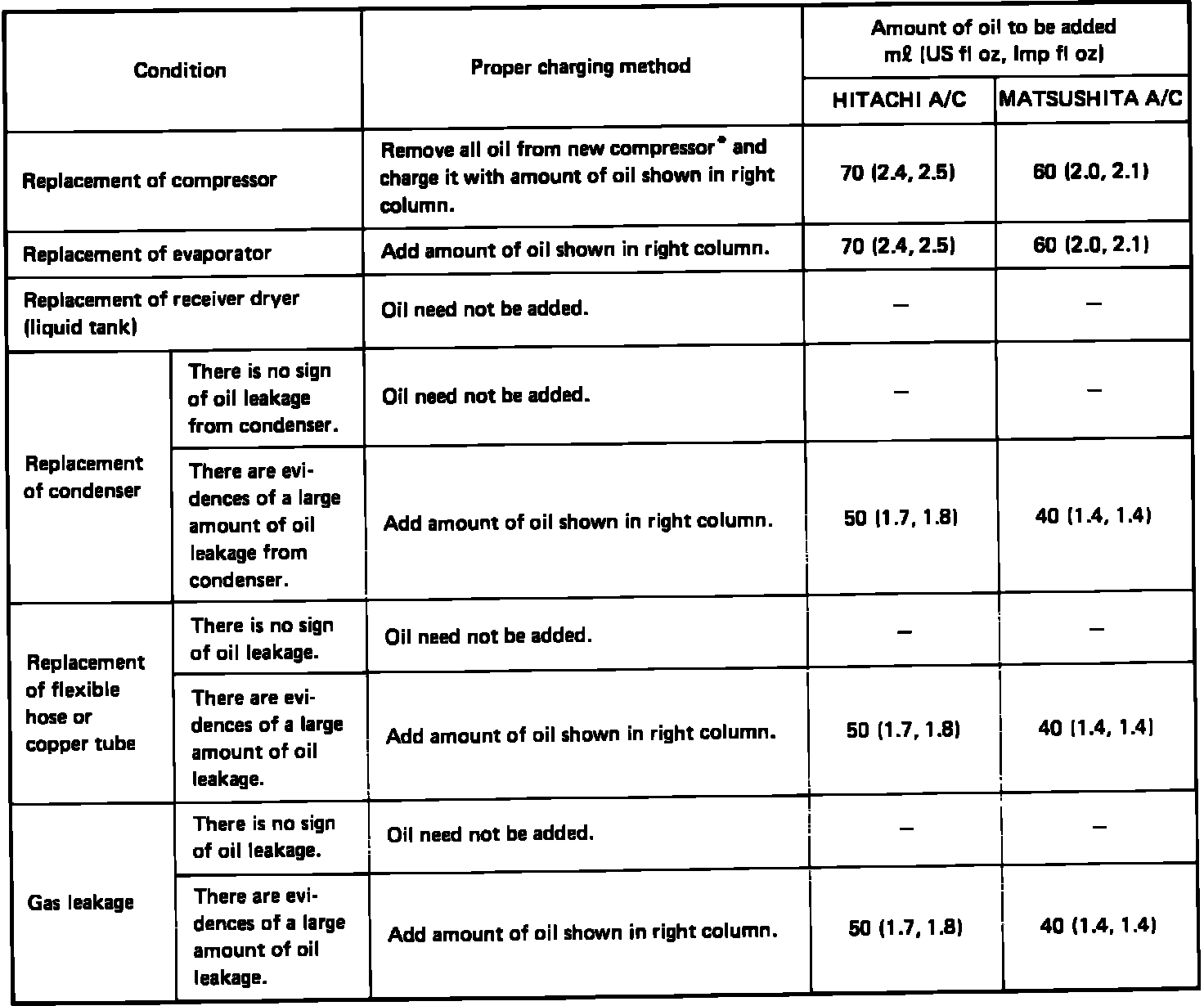 Oil Charge Table: