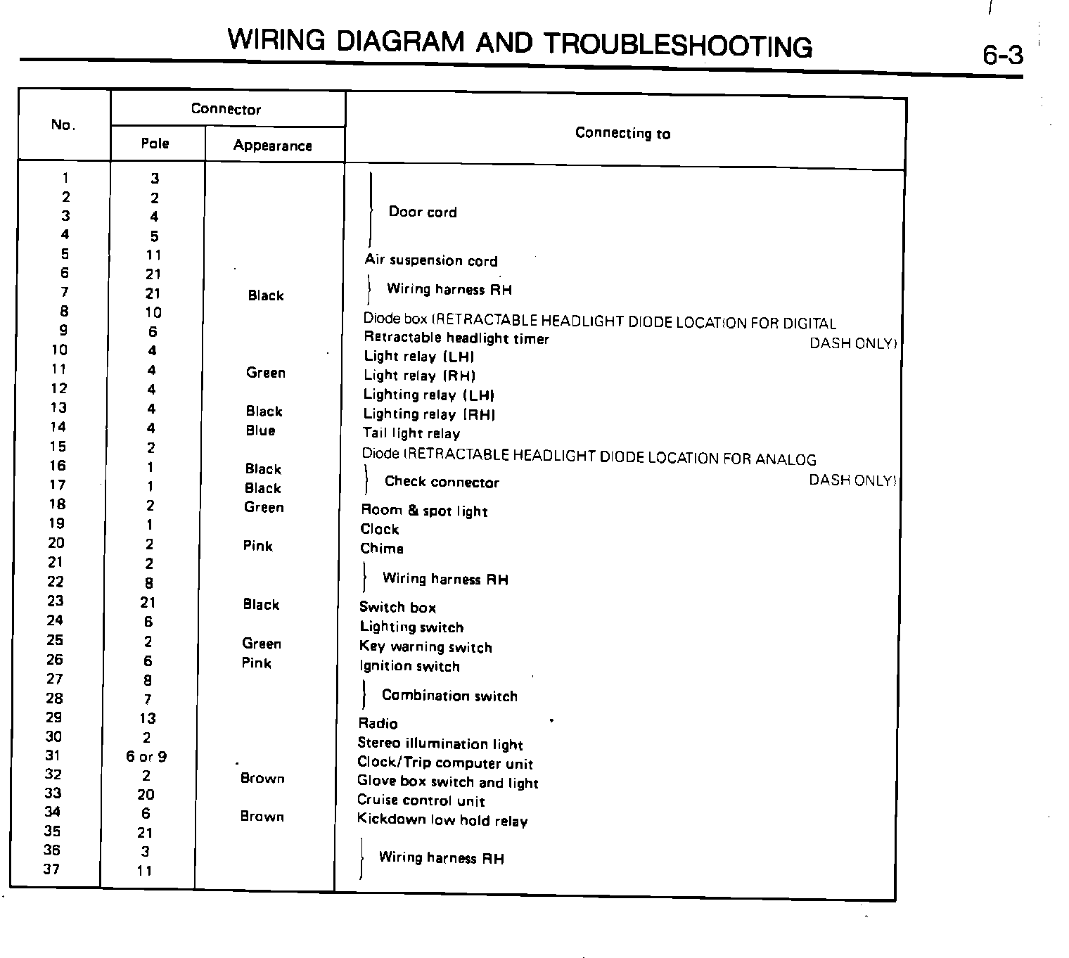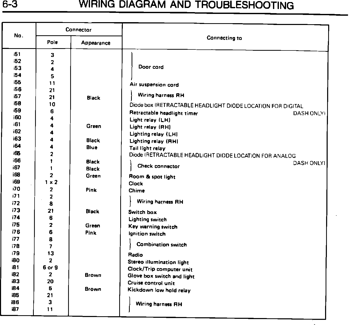 Connector #i58 identifies the location for the retractable headlight diode on digital dash models only. Connector #i65 identifies the location for models with analog dash boards only. See the revised listing attached.