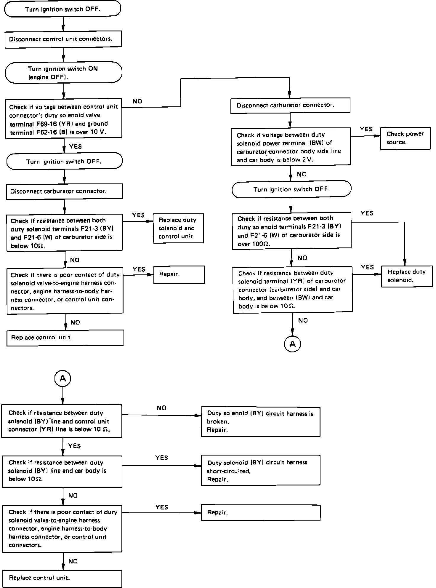 A faulty duty solenoid valve will set code 14 in the on-board diagnostic system. Refer to the schematic diagram and test the solenoid valve with the diagnostic chart.