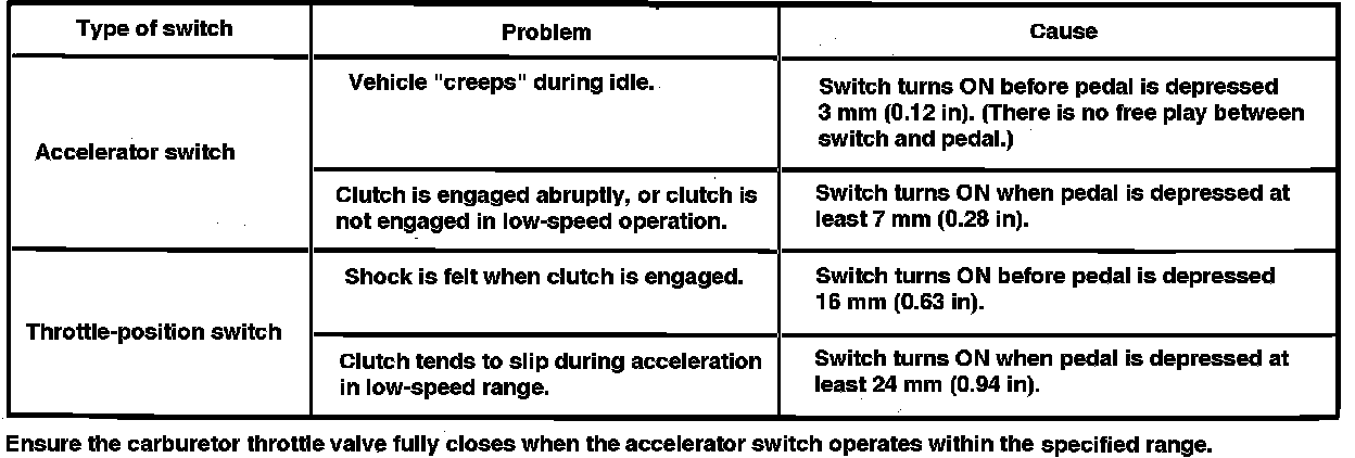 The accelerator switch should turn on .12-.28 inch from the accelerator pedal released position. The throttle position switch should turn on .63-.94 inch from the accelerator pedal released position. If either switch functions beyond specified ranges refer to chart, Fig. 13.
