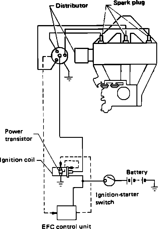 The EFC System control unit determines the optimum ignition timing from the crank angle signal and other engine operating information and transmits an operating signal to the power transistor, resulting in spark plug firing. The control unit signal causes primary current to flow to ground.
