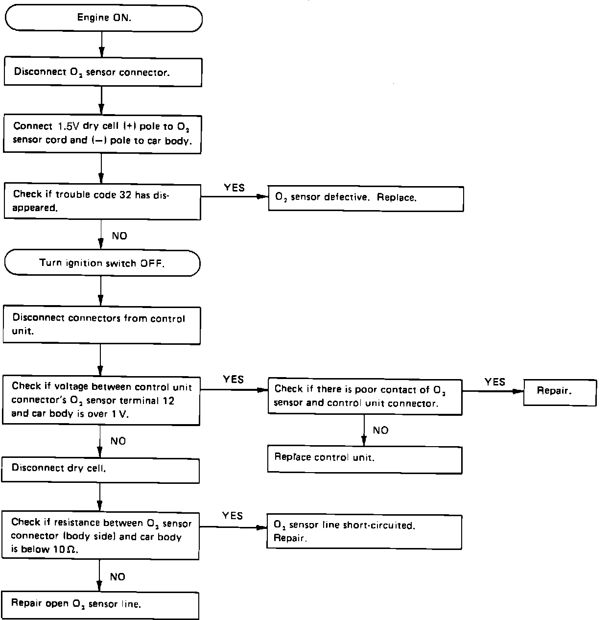 A faulty oxygen sensor will set code 32 in the on-board diagnostic system. Refer to the schematic diagram and test the sensor with the diagnostic chart.