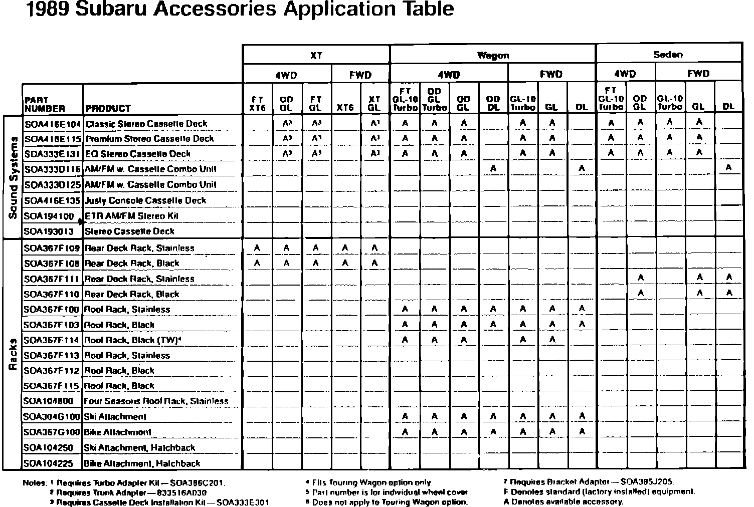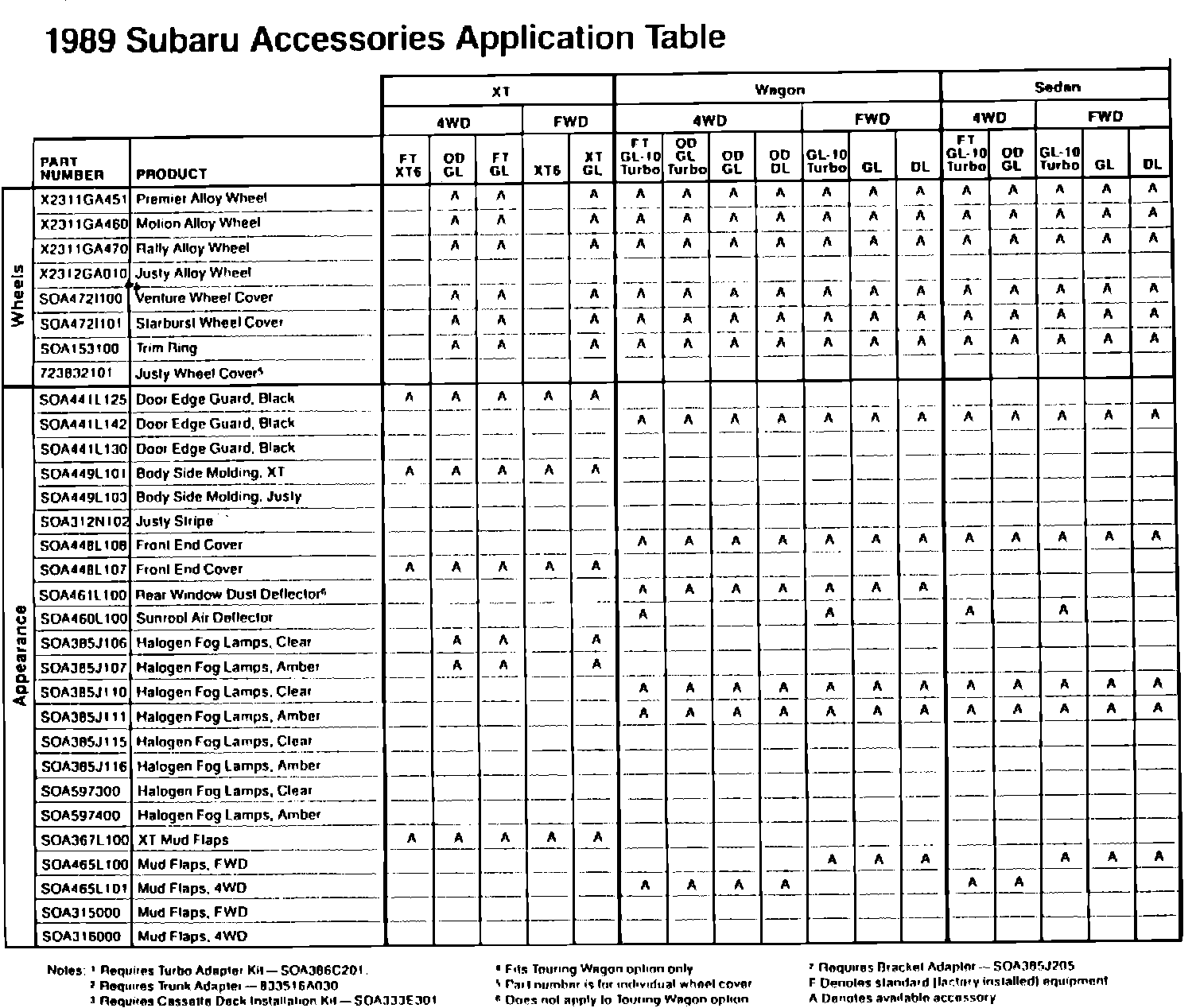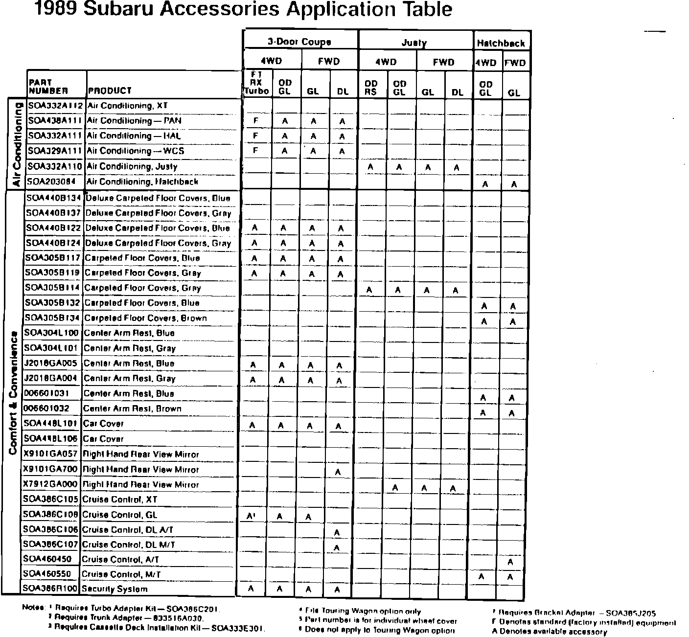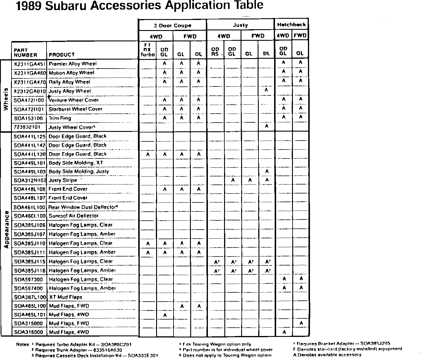 1989 Subaru Accessories Application Table