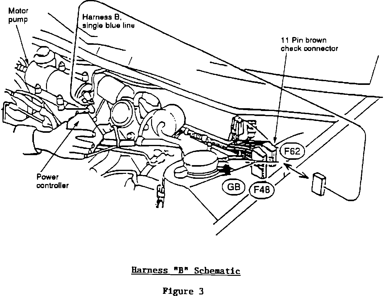 1. Before beginning, ensure the battery is still disconnected. Harness "B" is installed under the hood between the negative terminal on the motor pump and 11 pin brown check connector F62 located near the left strut tower. See Figure 3.