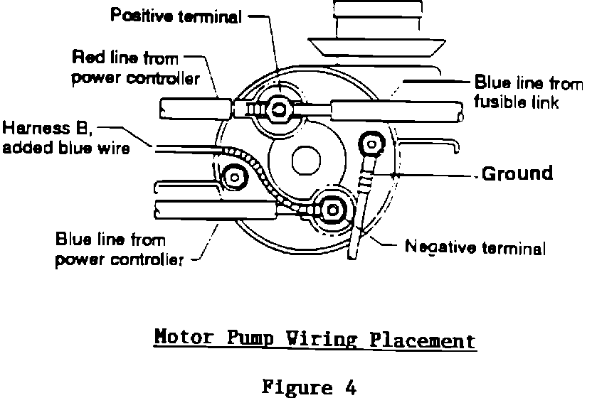 2. Remove the existing power controller. Note proper wire placement and orientation. To install new power controller, first insert the eye hook terminal of harness "B" through the rubber protector/insulator on the blue line from the new power controller and secure both to the negative terminal of the motor pump. See Figure 4.