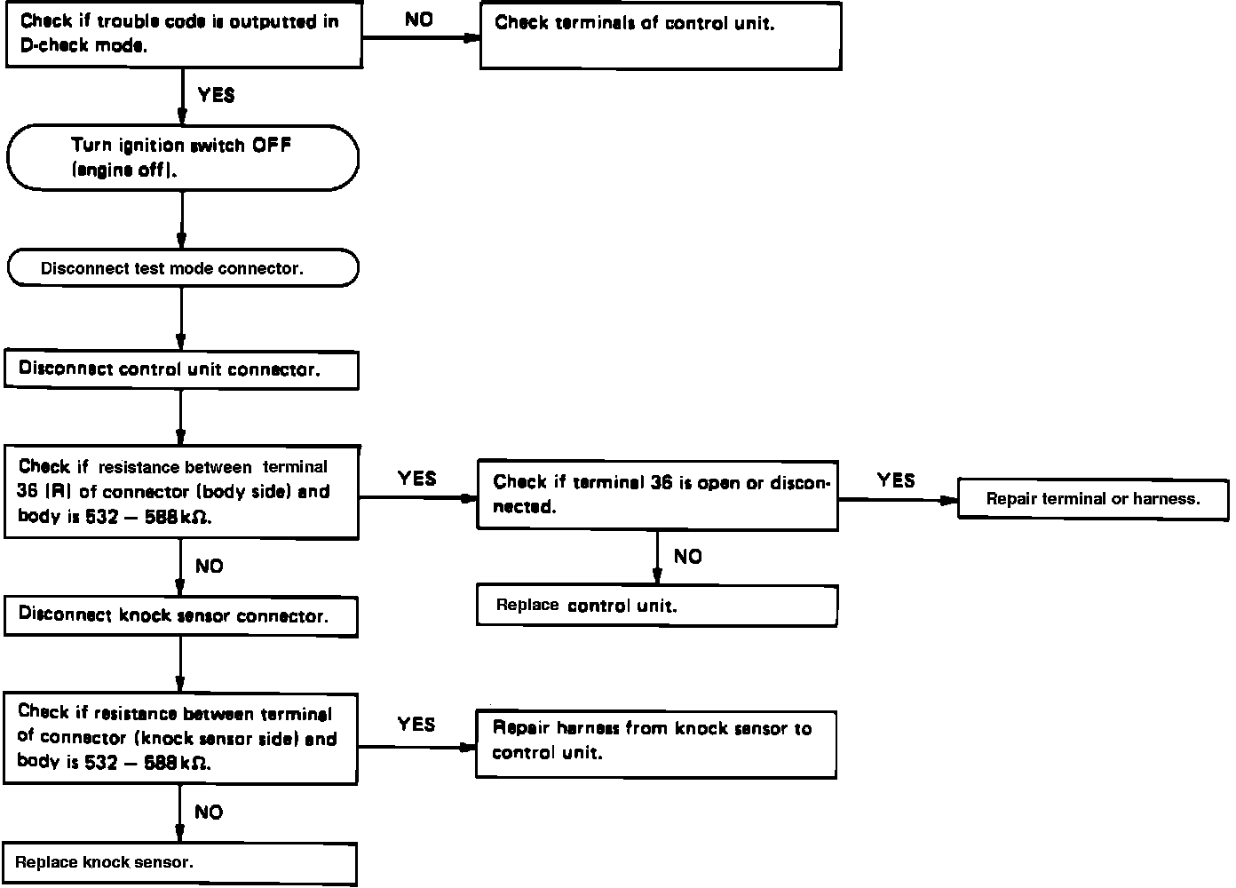A faulty knock sensor will set code 22 in the on-board diagnostic system. Refer to the schematic diagram and test the sensor with the diagnostic chart.