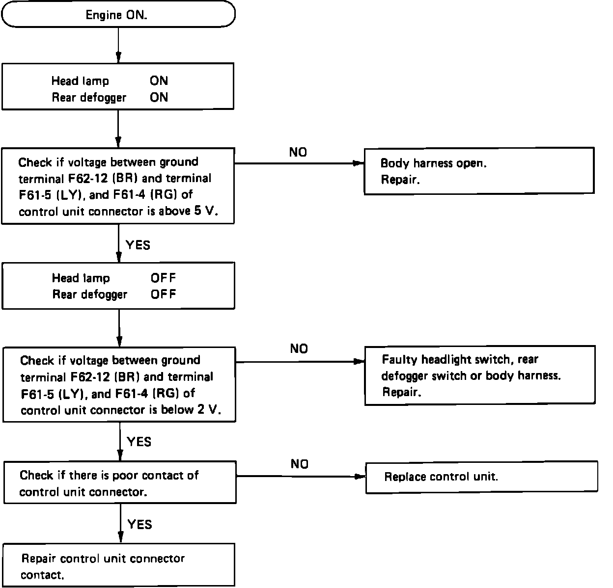 A faulty idle-up system will set one of two trouble codes in the on-board diagnostic system. Code 62 is caused by lighting switch or rear window defogger switch problems. Code 63 sets if the fan motor switch is bad. Wiring and/or bad connection problems in those circuits can also set the codes. Refer to the schematic diagram and test the system with the diagnostic chart.