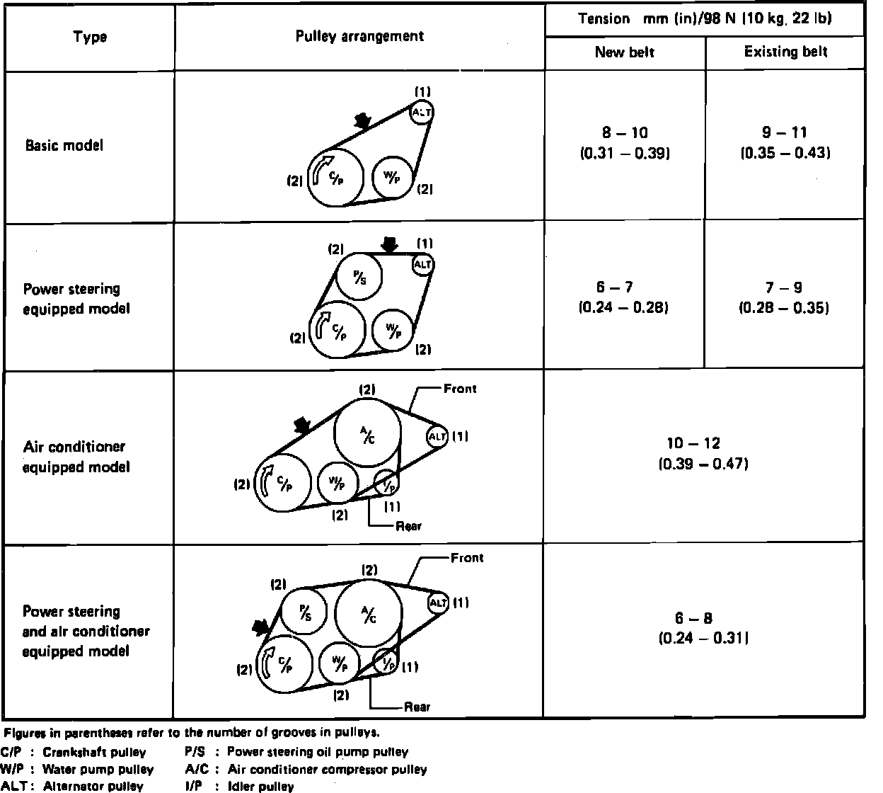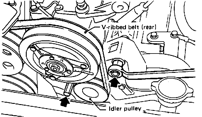 4. For new belt installation, readjust belt tension to specifications after running engine for five minutes.
