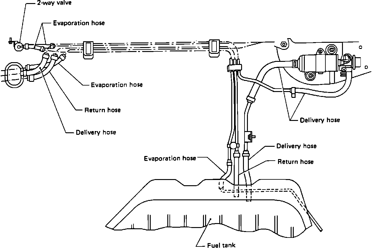 2. From under the vehicle, detatch fuel deliver and return hoses, evaporation tube and two-way valve.