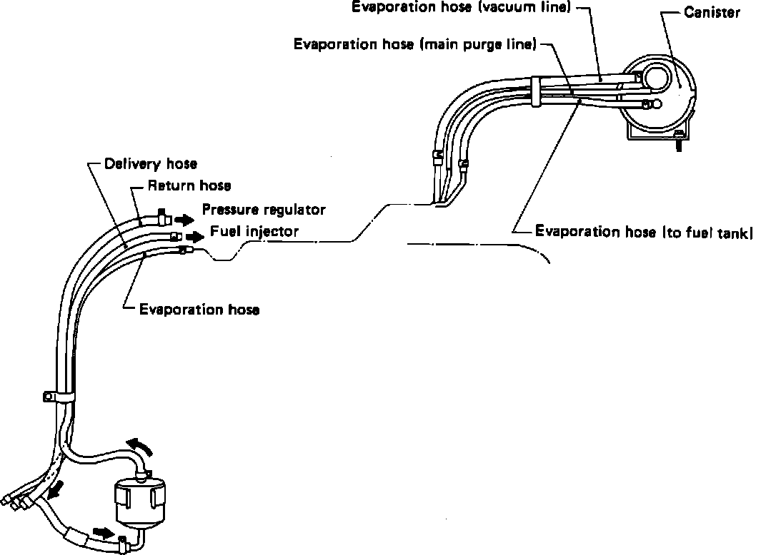 3. In the engine compartment, detatch fuel delivery and return hoses, evaporation tube and canister.