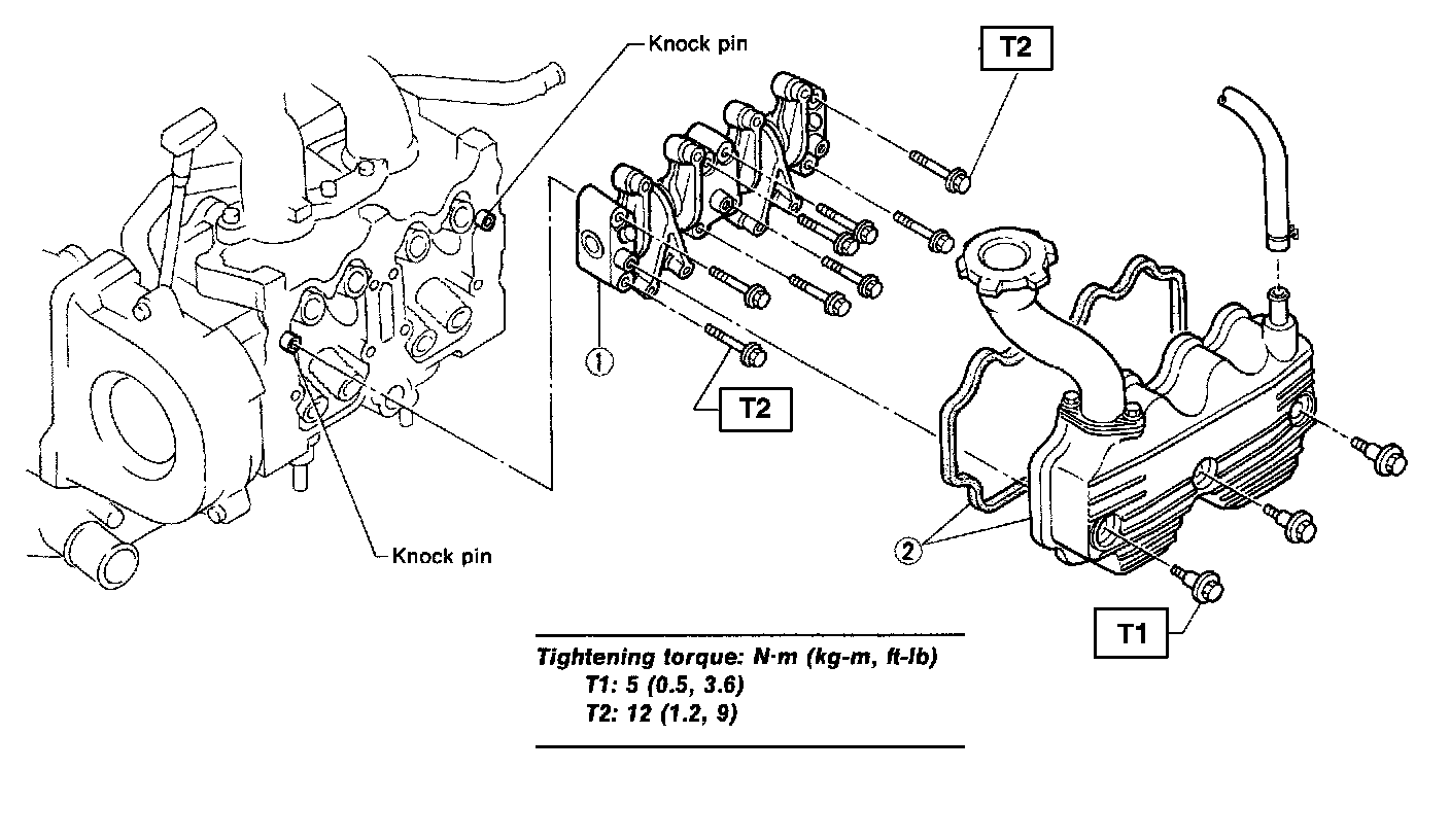 4. Tighten bolts (1) and (2) to 34 N.m (3.5 kg-m, 25 ft-lb).