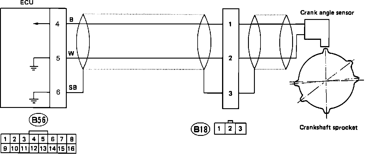 4. Connect ECU connector and measure resistance between crank angle sensor connector terminal (B18)3 and ground. It should be 1 Ohm maximum.