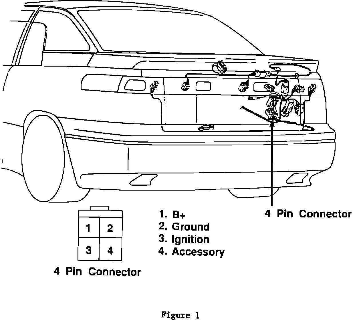 The SVX is pre-wired with a clear 4 pin female connector. This connector is located in the trunk behind the right trim panel. Note: This connector is the only recommended power source for cellular phone installation. The B+ terminal must be used for the main power source. This circuit is protected by the number 10 fuse (15 amp.) located in the fuse box at the left front kick panel. This connector also provides a power source for the ignition and accessory side of the ignition switch. A ground is provided. See Figure 1.