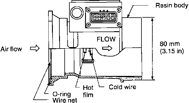 Whenever the ignition is ON, the sensor produces an output signal to the ECM. The hot-film sensing head acts as a temperature sensitive resistor. The ECU maintains the sensing head at a preset constant temperature. As air passes over the hot-film, it has a tendency to cool. Since the sensor head changes resistance based on temperature, a varying current is required to maintain constant temperature. The internal circuitry of the sensor monitors this changing current demand and sends a varying voltage output signal to the ECM, tracking current required.